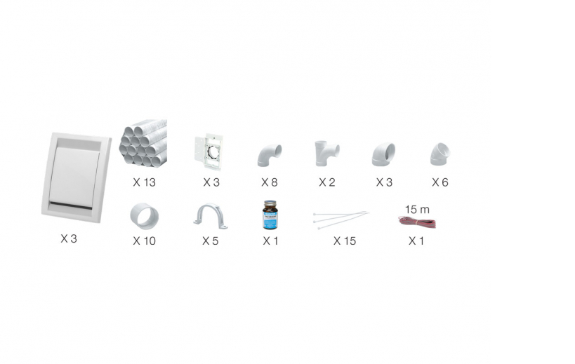 Ensemble d’installation – 3 prises murales blanches – Decovac – Inclus 13 tuyaux PVC 45 po (114,3 cm)
