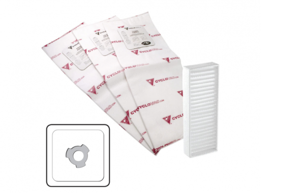Ensemble de sacs et filtre à poussière de carbone pour aspirateurs centraux Cyclo Vac. Cet ensemble comprend 3 sacs filtres électrostatiques robustes à 3 dents et 1 filtre à poussière de carbone. Ces sacs robustes sont conçus afin de les rendre plus solides. Notre filtre à poussière de carbone breveté retient la fine poussière noire produite par le moteur.